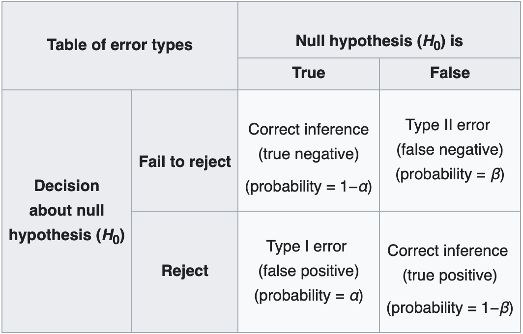 We also recognize that there’s always a chance that we will exclude \(H\) even if it’s true (called a Type I error, or a false positive), or not exclude \(H\) when it’s false (Type II error, or false negative). The probability of each is referred to as \(\alpha\) and \(\beta\), respectively. See this handy table from Wikipedia: